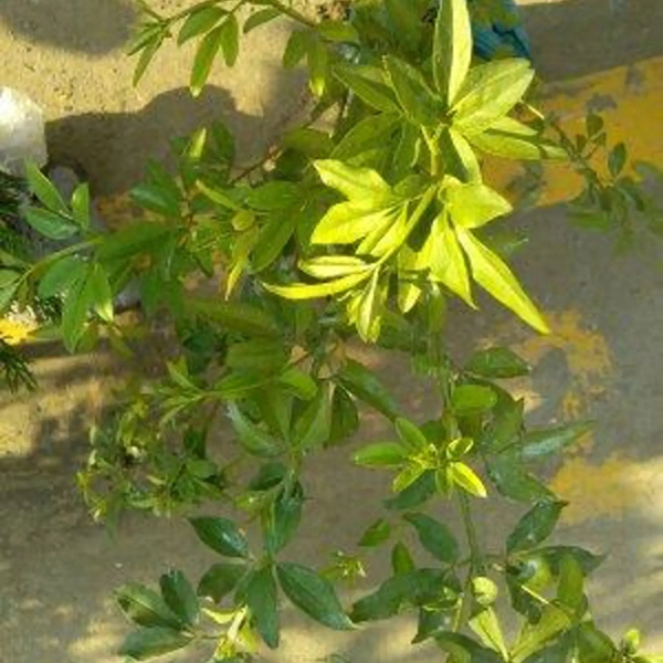野迎春(學(xué)名:Jasminum mesnyi Hance)是木犀科,素馨屬常綠直立亞灌木,高可達(dá)5米,枝條下垂。小枝四棱形,光滑無毛。葉對生,三出復(fù)葉或小枝基部具單葉;葉片和小葉片近革質(zhì),葉緣反卷,小葉片長卵形或長卵狀披針形,先端鈍或圓,頂生小葉片基部延伸成短柄,側(cè)生小葉片較小,單葉為寬卵形或橢圓形,有時幾近圓形,花通常單生于葉腋,稀雙生或單生于小枝頂端;苞片葉狀,倒卵形或披針形,花梗粗壯,花萼鐘狀,裂片小葉狀,披針形,花冠黃色,漏斗狀,果橢圓形,11月至翌年8月開花,3月-5月結(jié)果。