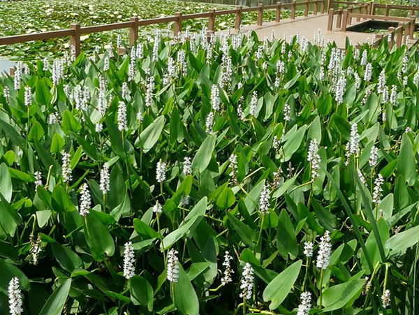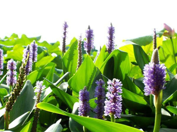 再力花(學(xué)名:Thalia dealbata Fraser):竹芋科,再力花屬多年生挺水草本植物。葉卵狀披針形,淺灰藍(lán)色,邊緣紫色,長50厘米,寬25厘米。復(fù)總狀花序,花小,紫堇色。全株附有白粉。